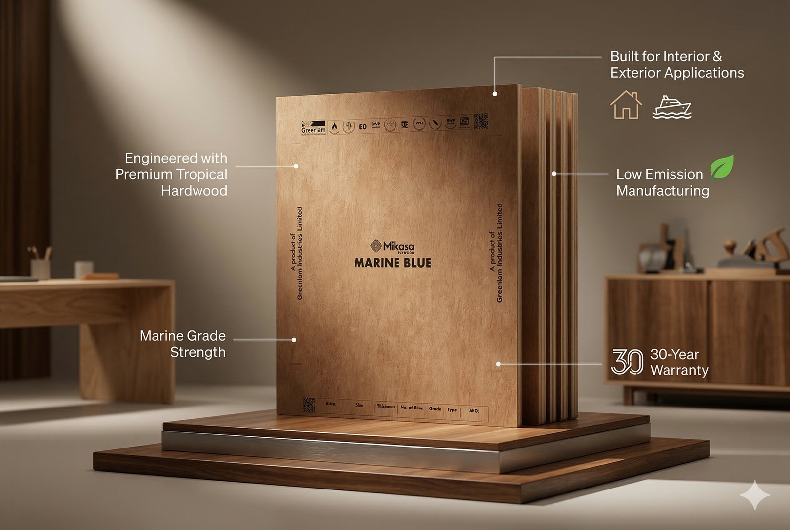 • It’s a premium marine-grade plywood crafted with selected hardwood veneers and BWP bonding for exceptional strength, durability, and superior water resistance.